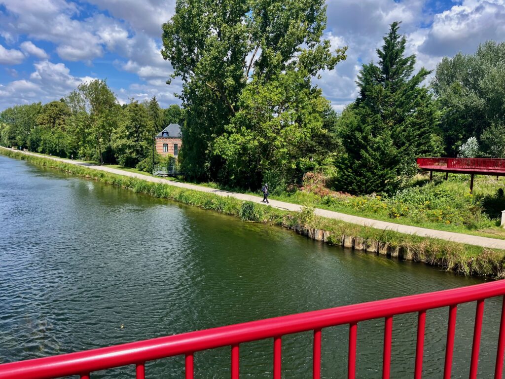 Om daar te komen, lopen we in het verlengde van de Quai Bélu waar we gegeten hebben, naar een rode brug. Deze is aangelegd over een zijtak van de Somme. En in een mooie ronding aan de andere kant weer uitkomt.